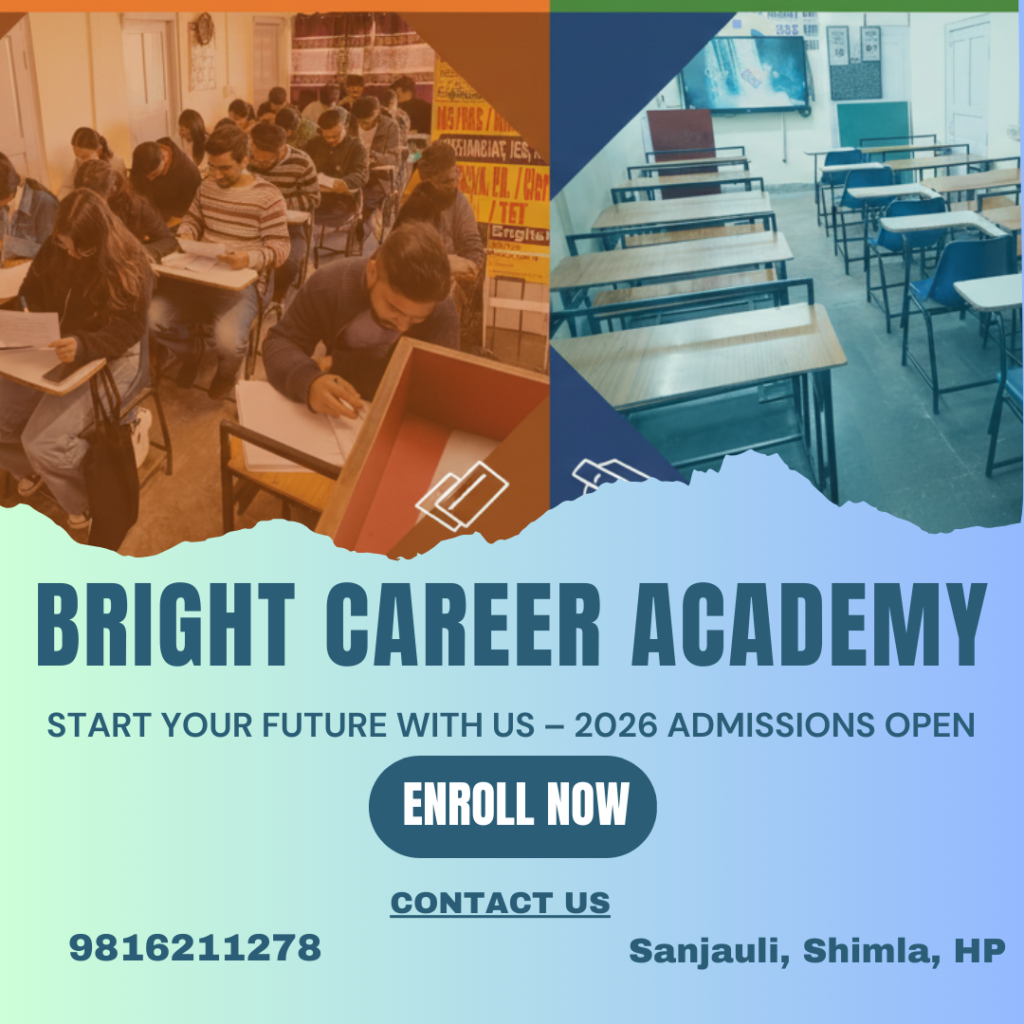 Shimla has grown into a center for preparation for competitive exams and students from all over Himachal Pradesh search for reliable banks with coaching centers that provide high-quality education with proven outcomes. Bright Career Academy fulfills this demand by providing well-structured classes, knowledgeable faculty and a student-centered learning environment.